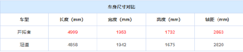 车身尺寸方面,开拓者的长宽高分别为4999mm×1953mm×1732mm,轴距为2863mm,相比之下冠道的车身整体小了一号,长宽高分别为4858mm×1942mm×1675mm,轴距为2820mm,毕竟两者存在级别上的差异。