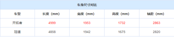 车身尺寸方面,开拓者的长宽高分别为4999mm×1953mm×1732mm,轴距为2863mm,相比之下冠道的车身整体小了一号,长宽高分别为4858mm×1942mm×1675mm,轴距为2820mm,毕竟两者存在级别上的差异。