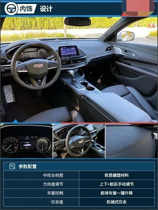 内饰设计方面,凯迪拉克CT4也同样以家族式设计为主,整体风格与CT5颇为相似,只是在功能分布和配置方面略有差异。仪表盘依旧为双圆造型的机械式仪表,黑底白字的显示风格清晰,虽然不如全液晶仪表那样具有科技感,但原始的机械造型更符合其运动化定位。同时,三辐式方向盘采用了两种皮质包裹,在三、九点位辅以打孔真皮,摩擦力更为出色。而中控台虽然能看见缝线装饰,但并未采用皮质包裹,而是软质搪塑材质。