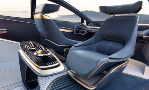 内饰方面,这款概念车的座舱设计十分前卫和时尚,它采用2+2四座布局,后排为两个“零重力”独立座椅。内饰采用高档天然材质,兼具舒适、豪华与现代气息。后排座椅可完全“躺平”,最大程度上满足用户出行休息需求。此外,后排两个座椅中间有一个多功能的扶手箱,造型以山水和茶具组成,极富有东方美感。