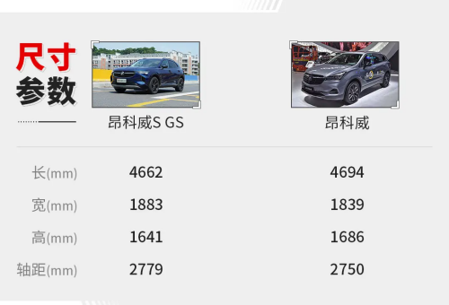 尺寸上来看,昂科威S GS在长度上比昂科威略微小上一些,但宽度与轴距有所提升,也证明了昂科威S GS运动化的定位。