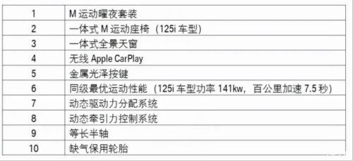 与此同时,新车还新增一体式M运动座椅,百度CarLife等多项惊喜配置,深度迎合年轻消费者口味。升级后的BMW 1系运动轿车共提供三款车型:120i M运动版,120i M运动曜夜版,125i M运动曜夜版,官方指导价如下表所示。
