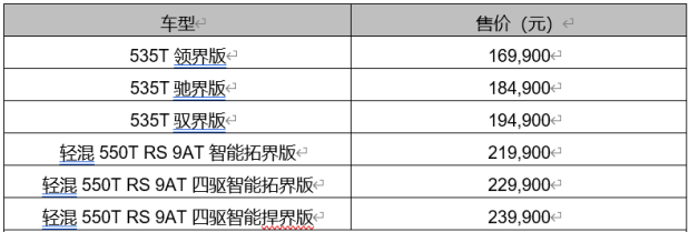 动力方面,2022款探界者依旧提供两种动力可选,535T车型搭载1.5T发动机,最大功率124kW(169马力)/5600rpm,峰值扭矩250Nm/1700-4400rpm,与该发动机相匹配的是6挡手自一体变速箱; 550T RS系列车型在雪佛兰2T9动力系统的基础上,升级标配48V轻混动力系统,最大功率174kW(237马力)/5000rpm,峰值扭矩350Nm/1500-4000rpm,带来更高效、更敏捷、更平顺、更富乐趣的驾驶体验。