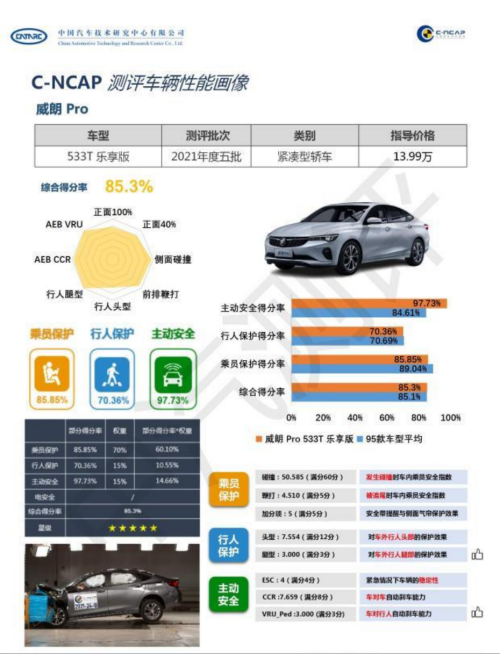 近日,C-NCAP发布了威朗Pro 533T乐享版车型的碰撞测试结果,根据各部分得分率乘以各自权重系数后求和,求得综合得分率为85.3%。因此,该车达到C-NCAP“五星级”标准。该车的具体得分如下: