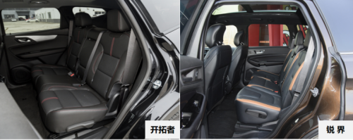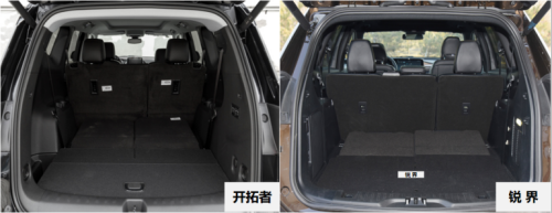 开拓者车身尺寸为4999×1953×1722mm,轴距2863mm;锐界的长宽高分别是4878mm、1925mm及1770mm,轴距则是2850mm。从数据上看,开拓者比锐界大出整整一圈。当然空间不能只看数据,不过在驾乘空间和空间利用率上开拓者的优势也更大一些。开拓者的第二三排座椅可自由调节,空间可根据乘坐者感受优化,还配置了座椅一键电动翻折按钮,快速放倒更方便。行李箱容积上锐界可以达到233-2039L,数据上看更有优势。可是开拓者全车共计37处储物空间,后备箱也更注重储物能力,有效弥补了这一点小缺憾。且开拓者可采实现三排放到和二三排均方平的自由组合模式,灵活多变的空间给了驾车者更多的空间用途。