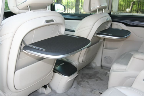 座椅面前的小桌板,比民航机上的小桌板讲究多了,首先是支架很牢固,不是简单地弄个合页,让小桌板能放下来就行了;其次是桌面的造型与材质也很考究,能够很好适应行车环境。