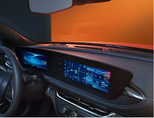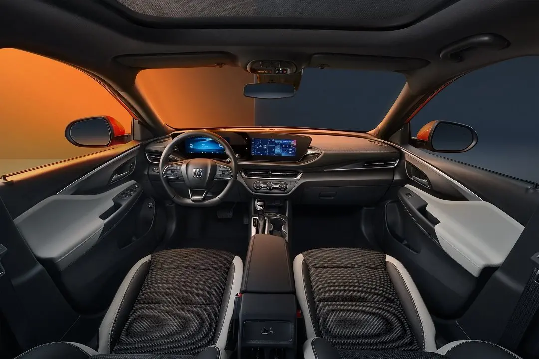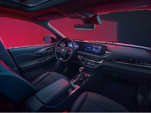 别克昂扬Envista采用家族环抱一体式座舱设计,内饰座舱布局采用环形曲线贯穿整个前座舱衔接两侧车门,整个座舱形成曲面包围的布局。并采用双色色系搭配以来突显出年轻化的氛围感。