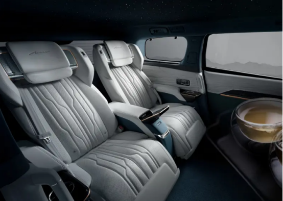 如果说别克世纪的六座版已经做到了足够舒适,那么它的四座版本就堪称奢侈了,它开创性地引入一键可升降豪华智慧幕墙系统,乘客坐在后排可以将32寸智能屏升起,将后排座舱隔绝成为一个独立的私密空间,想要洽谈一些商业机密是非常合适的场所,而且乘客还能通过摄像头来观察前舱以及路况,也可以通过对讲系统与前排进行沟通。值得一提的是,这套豪华智慧幕墙系统不仅仅是一个大屏幕那么简单,还集成了时钟、收纳、冰箱、扩香盒、音响等功能,能够满足多元化的使用场景。此外,四座版车型的160度云感座椅堪称汽车座椅界的“天花板”,无论内外用料还是所支持的功能都达到了顶级水准。