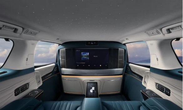 四座私享版车型引入豪华智慧幕墙系统,集成32吋可升降智能屏,只需一键,即可将后排升级为奢华与静谧兼备的“私享空间”。该幕墙系统不仅支持多媒体内容在线播放、多模式智能手机投屏,还囊括8吋时钟显示屏、Bose音响、13L礼宾冰箱、弹出式大容量储物箱、扩香盒等豪华科技配置,营造出沉浸式的人文智能空间。