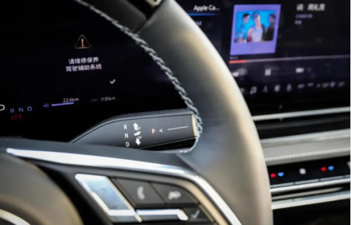 在方向盘的左侧设计有一个拨片,用于控制车辆动能回收的加减。而在这块拨片下面,还有一个用于控制音乐的按键,方便车主在行驶时盲操,这算是设计上的一点巧思。