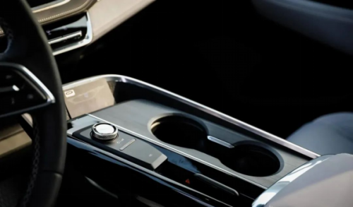 将目光移到门板上,也能够看出别克 E5 对于豪华塑造的细节点。和现在的很多豪华车型一样,别克 E5 将座椅调节、腰托调节的按键放置在了门板的位置,并且细节上按键有镀铬点缀、底部的面板也有线状的纹理,给我的感觉是有质感且耐看。 再往方向盘的右手边看,目光所及的是车辆的悬浮式中控岛区域,在这块集成了多媒体音量控制、卡片钥匙识别区、手机无线充电区域和带限位器的水杯架。