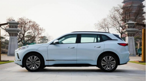 车身侧面,可以看到 E5 在整体的姿态塑造上基本采用比较平直且稳重的线条,这也符合其作为一台家用 SUV 的定位。车身尺寸方面,新车长宽高分别为 4892mm × 1905mm × 1655mm,轴距为 2954mm,定位中大型 SUV。 细节上,别克 E5 采用了电动按压式的开启方式,关闭时也可以通过点击右上角的按键进行电动关闭,别克的三色盾标在这里起到了一定点缀作用。
