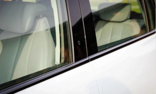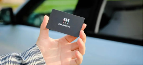 在车辆的 A 柱上有一块识别区,这一块可以通过卡片钥匙识别解锁。在卡片钥匙的设计上,别克的三色盾徽标采用了立体的样式,颇有质感。