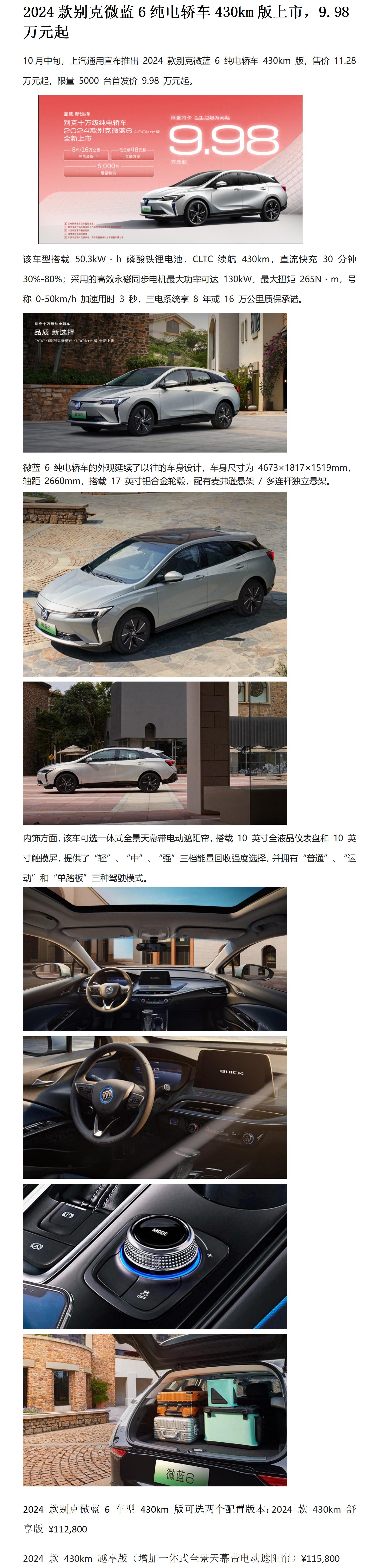 2024款别克微蓝6纯电轿车430km版上市,9.98万元起