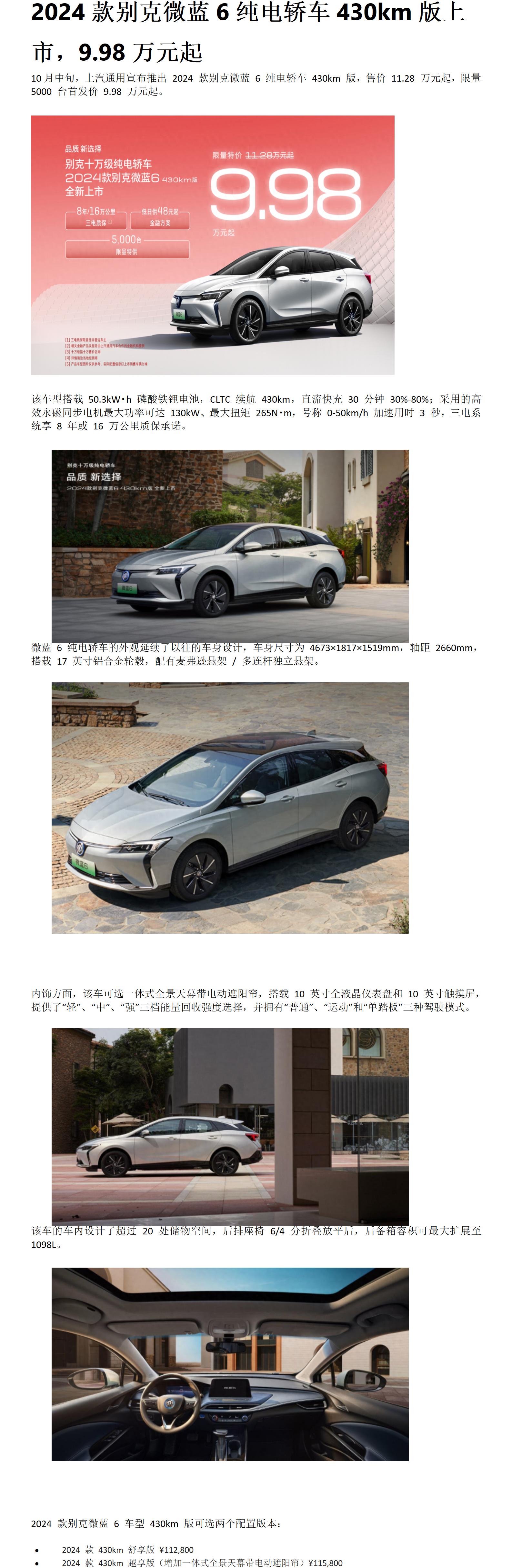 2024款别克微蓝6纯电轿车430km版上市,9.98万元起